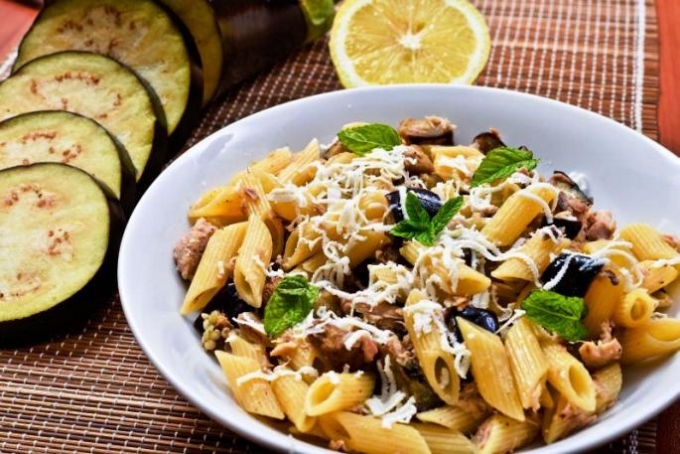 Salată de paste cu ton, vinete și mentă
